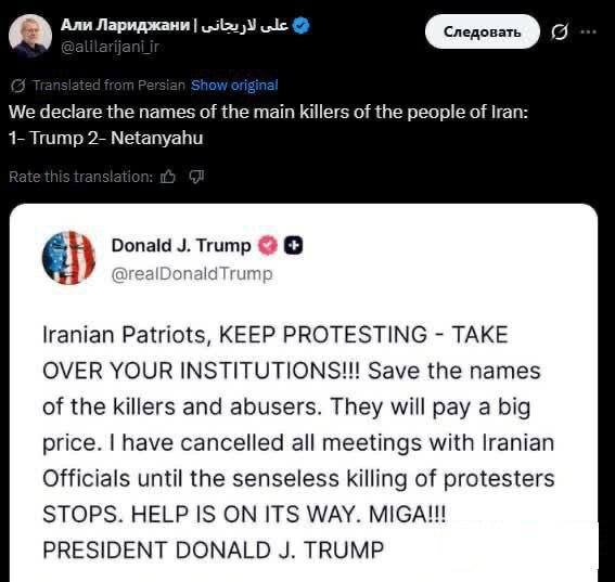 «Мы объявляем имена главных убийц народа Ирана: 1. Трамп 2. Нетаньяху».