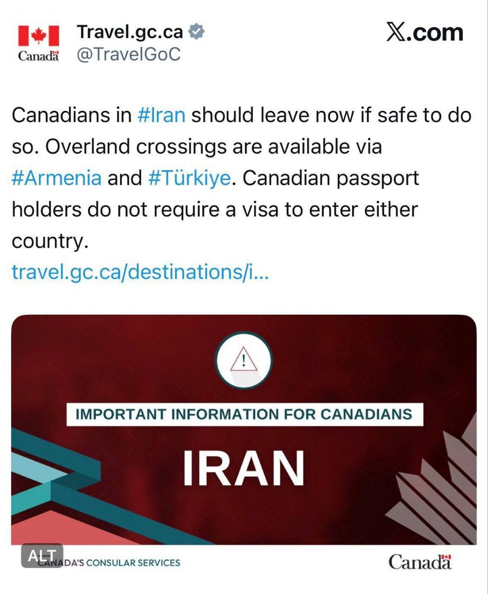 «Канадцам, находящимся в Иране, следует покинуть страну немедленно, если это безопасно. Сухопутное пересечение границы из страны возможно через Армению и Турцию. Владельцам канадских паспортов для въезда в обе страны виза не требуется», — говорится в сообщении официального аккаунта правительства Канады с советами для путешествующих граждан. Ранее сообщалось, что США призвали американцев покинуть Иран. В прошлый раз такое предупреждение выпускалось незадолго до ударов по Ирану. Позднее Трамп призвал иранцев продолжать протесты и захватывать госучреждения. Также Трамп ответил на вопрос, какая помощь направляется в Иран: «Вы скоро узнаете» «Хорошая идея, если американцы эвакуируются из Ирана», — добавил он. 💬Canada followed the United States in urging citizens to leave Iran. "Canadians staying in Iran should leave the country immediately if it is safe to do so. Land border crossing from the country is possible through Armenia and Turkey. Holders of Canadian passports do not need a