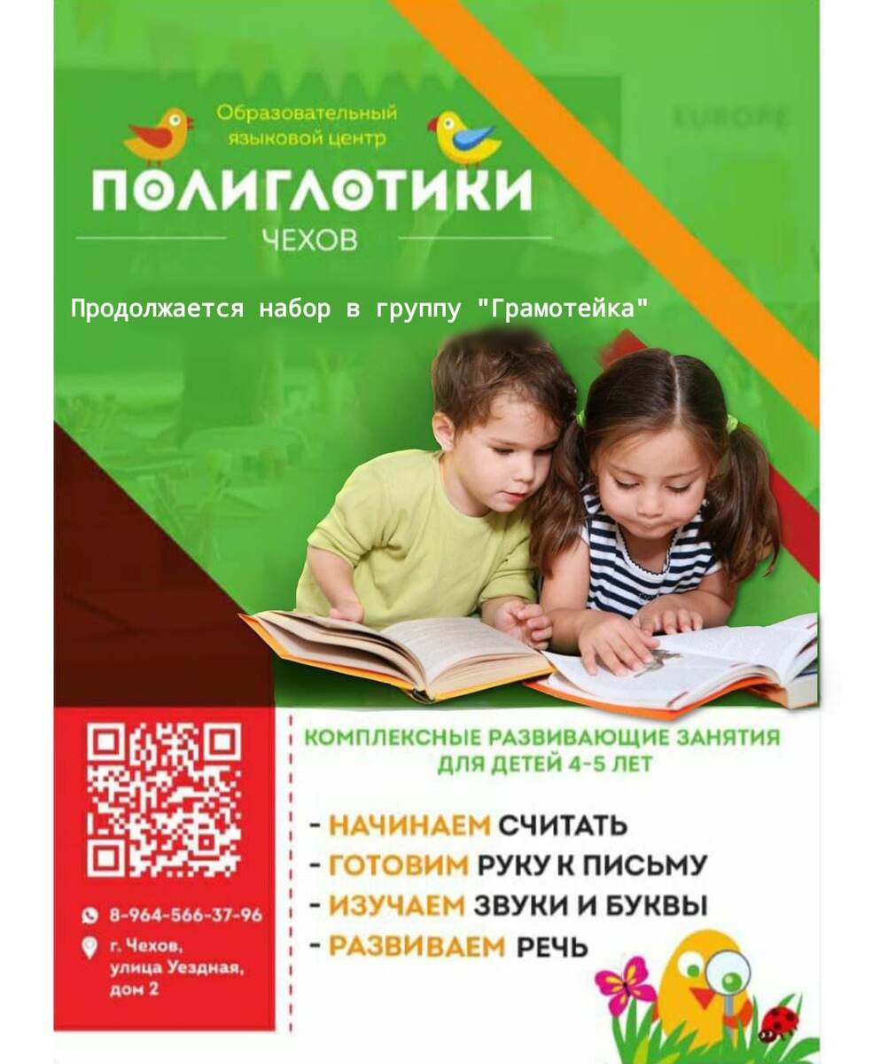"⭐ Комплексные развивающие занятия для детей 4-5 лет⚡ На курсе ГРАМОТЕЙКА дети: 💡Разовьют логическое мышление, внимание, память,мелкую моторику рук, зрительную и слуховую память⠀ 💡Научатся делить слова на слоги 💡Расширят словарный запас⠀ 💡Разовьют пространственное и логическое мышление⠀ 💡Научатся считать до 10 Расписание : 🗓 Вторник/четверг ⏰18:40 🏢 Языковой образовательный центр "ПОЛИГЛОТИКИ" 📍 г. Чехов, ул. Уездная, д. 2 🔗 Напишите нам: https://wa.me/message/KHZUP73MS7OCH1 🌟Соц.сети: 🔥https://vk.com/poliglotikichekhov 🔥https://dzen.ru/id/65d5ffd4021a5d4953ccf615 🫶 Получить консультацию и записаться: 🫶 Поддержите нас голосами