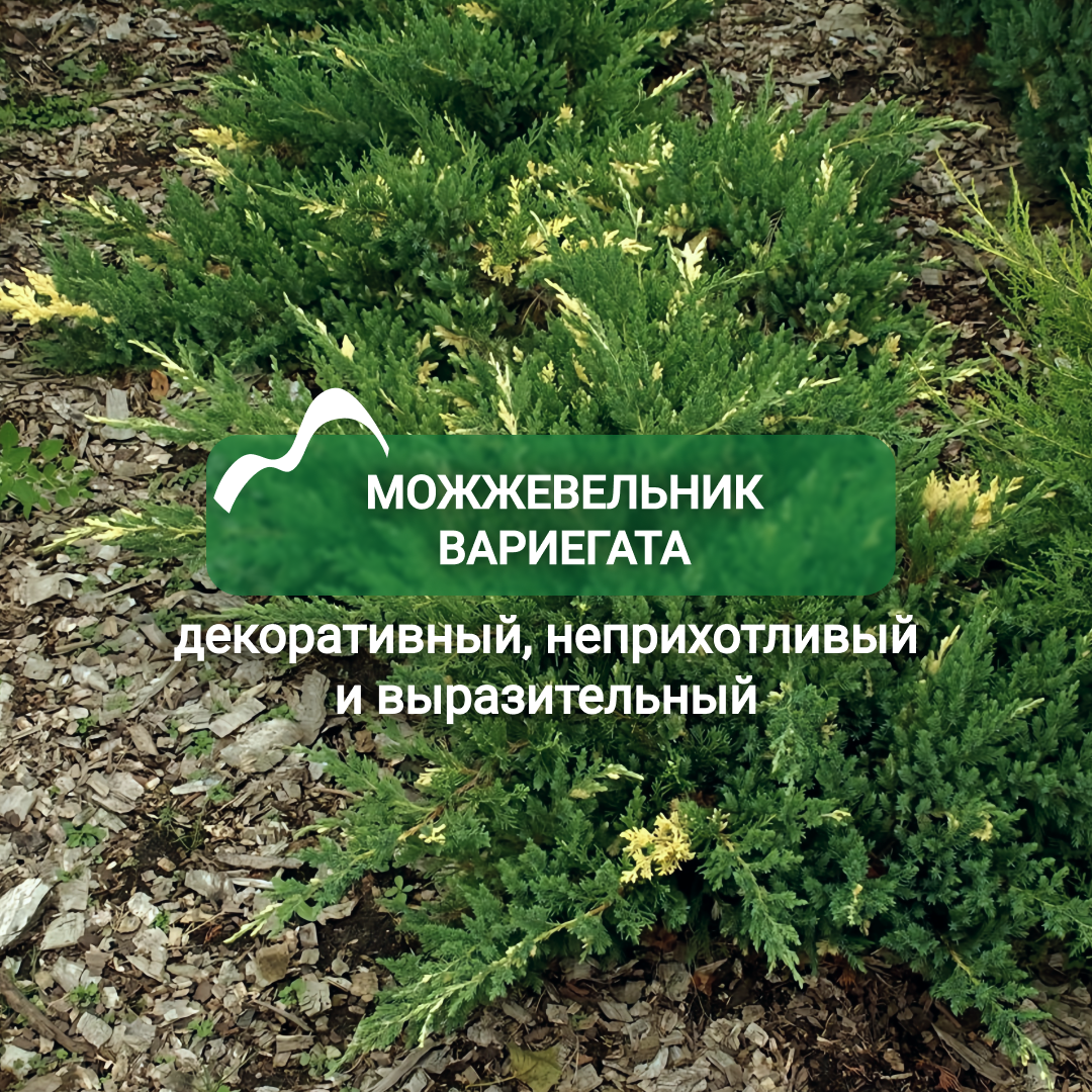 Можжевельник казацкий Вариегата — низкорослый кустарник с раскидистой кроной и необычным двухцветным окрасом. Хвоя сочетает зелёный цвет с белыми вкраплениями и золотистым оттенком, благодаря чему растение остаётся ярким на протяжении всего сезона. Длинные побеги с изящно изогнутыми верхушками создают плотное, декоративное покрытие для земли. Основные характеристики: 🌱 Высота до 1 м, диаметр кроны до 1,5 м 🌱 Медленный рост, крона долго сохраняет компактную форму 🌱 Светолюбив, переносит полутень 🌱 Зимостойкость высокая, выдерживает городские условия и непродолжительную засуху 🌱 Неприхотлив к почвам, предпочитает рыхлые слабокислые суглинки или супеси Вариегата легко вписывается в разные композиции. Он отлично смотрится в одиночных посадках, подчёркивая красоту газонов или других растений. Также подходит для групповых композиций, вересковых садов и декоративных миксбордеров. Растение не требует частого полива и сложного ухода, достаточно периодической обрезки весной или осенью для п