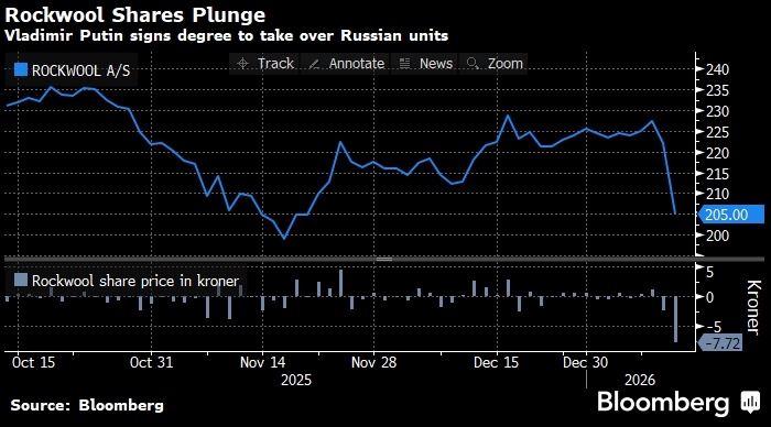 Компания больше не контролирует 4 завода на территории РФ. График: Bloomberg. Акции компании Rockwool на бирже в Копенгагене продемонстрировали самое сильное падение почти за 5 месяцев, после новости о том, что Владимир Путин распорядился арестовать российские активв датской компании. Акции крупнейшего в мире производителя теплоизоляции из минеральной ваты упали 13 января на 10%, что стало самым большим однодневным падением с 20 августа. Путин подписал Постановление о назначении временного управляющего в отношении двух российских подразделений фирмы. Активы передаются во временное управление российской компании. Компания подверглась критике за то, что не ушла из своего российского бизнеса, как это сделали несколько других европейских компаний после 2022 года. Датская компания неоднократно защищалась, заявляя, что уход из России фактически означал бы… подарок. Россия взяла под контроль четыре завода компании в России, и компания больше не контролирует свои активы в стране. В заявлении R