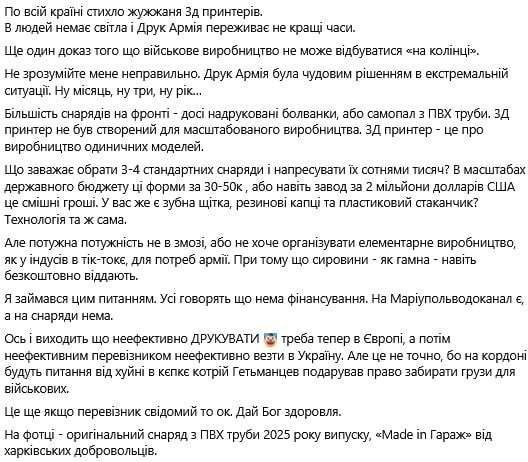 И вот какол грустит: По всей стране стихло жужжание 3д принтеров. У людей нет света и печать армия переживает не лучшие времена. Еще одно доказательство того что военное производство не может происходить «на коленке». Большинство снарядов на фронте - до сих пор напечатанные болванки, или самопал из ПВХ трубы. "Мощная мощь" не в состоянии, или не хочет организовать элементарное производство, как у индусов в ТИК-токе, для нужд армии. При том что сырья - как гамна - даже бесплатно отдают. Я занимался этим вопросом. Все говорят что нет финансирования. На "Мариупольводоканал" есть, а на снаряды нет. Вот и получается что печатать надо теперь неэффективно в Европе, а потом неэффективным перевозчиком неэффективно везти в Украину. Но это не точно, потому что на границе будут вопросы от хуйни в кепке которой Гетманцев подарил право забирать грузы для военных. Никак не поймут, что самое неэффективное в данных условиях - продолжать защищать хунту, которая меняет жизни граждан на европейские шеке