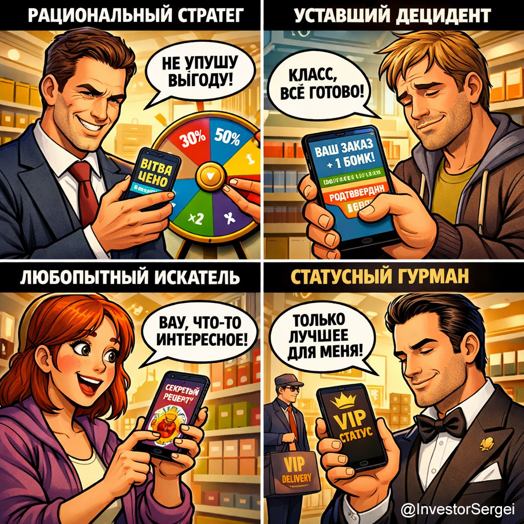 Наслушался на конференции докладов маркетологов, которые изобретают все более изощренные методы завлечения клиентов через программы лояльности, кэшбэки и прочую наживку. Вот как в одной компании делят покупателей, которые пользуются приложениями, и какими способами цепляют. 👉 Что цепляет: Неприятие потерь 😏 Чего он на самом деле хочет: Чувства, что он максимально выгодно использовал ситуацию. Боль от упущенной выгоды сильнее радости от простой скидки. 😍 Какие фишки любит: • «Битва цен» • «Колесо фортуны в конце заказа» 🤗 Как зацепить: Не просто дать скидку, а дать возможность её выиграть. Децидент — тот, кто вынужден принимать решения. 👉 Что цепляет: Когнитивная лёгкость 😏 Чего он на самом деле хочет: Избавления от необходимости принимать решение. Устал выбирать, хочет минимальных усилий. 😍 Какие фишки любит: • «Корзина-помощник» • «Подписка на автозаказ» 🤗 Как зацепить: Приложение «запоминает» частые заказы и предлагает оформить их в 1 клик.