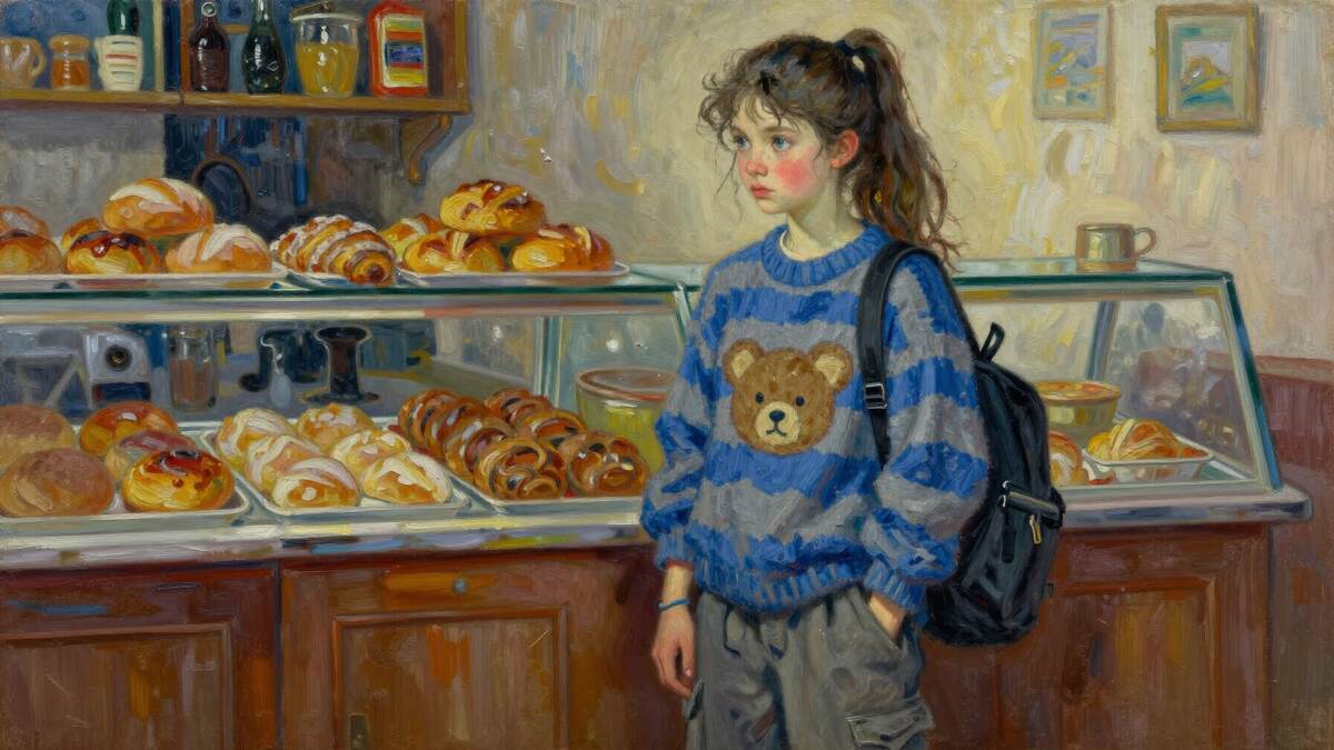 ИНТ. МАГАЗИН — ДЕНЬ Звук колокольчика над дверью резко вырывает Катю из тяжёлых воспоминаний. В магазин входит Нина — тихая, настороженная, словно зверь, зашедший на чужую территорию. Катя машинально здоровается и, будто очнувшись, направляется к кассе. НИНА — хрупкая девушка‑подросток с сильным характером, сирота. В её облике — странная смесь беззащитности и упрямой стойкости. Её длинные тёмные волосы небрежно собраны в высокий хвост; несколько непослушных прядей мягко обрамляют лицо. Тонкие черты, большие выразительные глаза с задумчивым, почти отрешённым взглядом. На щеках — лёгкий румянец, будто от недавнего бега. На запястье — тонкий браслет, единственная драгоценность, память о ком‑то важном. Одежда поношенная, с едва заметными пятнами: объёмный полосатый свитер в сине‑серых тонах с нашивкой в виде медвежонка (немного великоват, придаёт образу уязвимую непринуждённость); свободные серые карго‑брюки с множеством карманов; классические сине‑белые кеды. Вместительный чёрный рюкзак в
