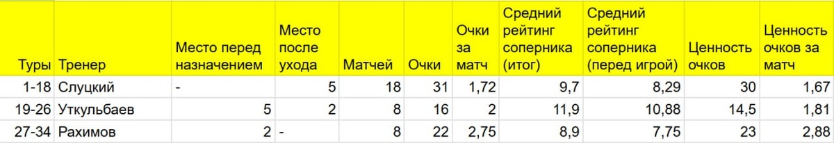 ? И, вот ужас, мы посчитали. И придумали свою схему ценности очков в Первой лиге в сезоне 22/23. Учитывали сложность соперника (место в таблице перед туром и итоговое место) и то, где сам Рубин был перед каждым туром. Очки с командами, занявшими итоговое 2-6 места, мы умножили на 2. Очки с командами, ставшими 7-11, мы оставили как есть. А очки с командами с 12-18 мест мы поделили на два. Получается такой ранг уровня сложности. В итоге получился такой рейтинг: 1️⃣ Рахимов - 2,88 очка ценности за матч 2️⃣ Уткульбаев - 1,81 очка ценности за матч 3️⃣ Слуцкий - 1,67 очка ценности за матч Теперь немного пояснений. Например, у Уткульбаева были самые легкие соперники. Средняя разница итоговых мест - почти 12. У Слуцкого - почти 10, у Рахимова - почти 9. Аналогичная ситуация и с разницей позиций перед каждой игрой. Слуцкий в среднем набирал 1,72 очка за матч. Этого бы хватило, чтобы по итогам сезона занять 3 место, набрав 58-59 очков. Второй была бы Алания, которую все равно не допустили