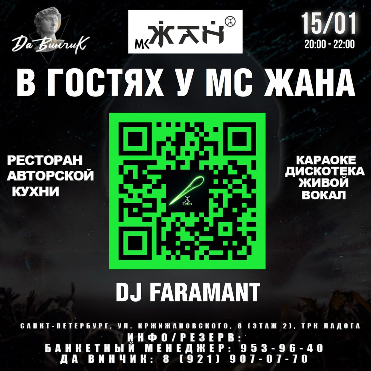 » Дата: 15 января (четверг). Время: 20:00. Место: рестобар «DaVinchik». Регистрация на событие: https://mcdj.timepad.ru/event/3764593/ Участники: МС Жан (Дмитрий Бажанов) — автор музыки и текстов, резидент «Радио Рекорд», президент СМИКВИД.РФ; DJ FARAMANT — российский диджей и музыкальный продюсер (жанры: hard house, tech house, break beat, power house); проект «Ж» — новый музыкальный проект, уже получивший вирусную популярность. Вечер объединит: авторские композиции МС Жана (включая хиты «Сказочный Мим», «Ночная Леди», «Имя твоё»); презентацию проекта «Ж» — вы услышите свежие треки и узнаете, как создаётся современная музыка; интерактивную часть о роли ИИ в музыкальном творчестве — как технологии становятся партнёрами артиста. Особенности мероприятия Семейный формат: можно прийти с детьми. Для юных гостей подготовлена образовательная программа — показ процесса создания музыки и объяснение, как ИИ помогает артистам. Диалог с артистами: МС Жан ответит на вопросы, поделится историями