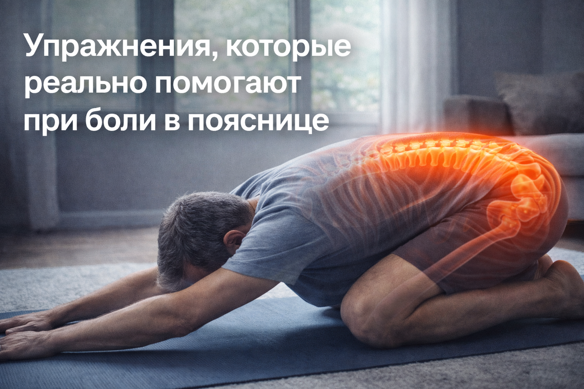 Боль в пояснице — одна из самых частых жалоб у взрослых. После 35 лет каждый второй хотя бы раз сталкивался с этим дискомфортом. После 50 — почти каждый. Парадокс в том, что большинство людей думает: если болит спина — надо лежать и ничего не делать. Но это одна из главных ошибок. Движение — это то, что в разумных дозах лечит. Главное — не навредить. Поясница — центр нагрузки. Она держит наш корпус при ходьбе, сидении, наклонах. Со временем мышцы спины слабеют, а малоподвижный образ жизни приводит к сдавливанию межпозвонковых дисков и спазмам. Частые причины боли: Никакие мази и таблетки не устранят причину боли, если мышечный корсет продолжает слабеть. Зато грамотно подобранные упражнения — могут. Простое и безопасное упражнение для снятия давления с межпозвонковых дисков. Как выполнять: Держим 20-30 секунд, повторить 3 раза. Отлично снимает утреннюю скованность. Успокаивает спазм мышц поясницы и растягивает позвоночник. Как выполнять: Дышим глубоко, держим 30–60 секунд. Укрепляет яго