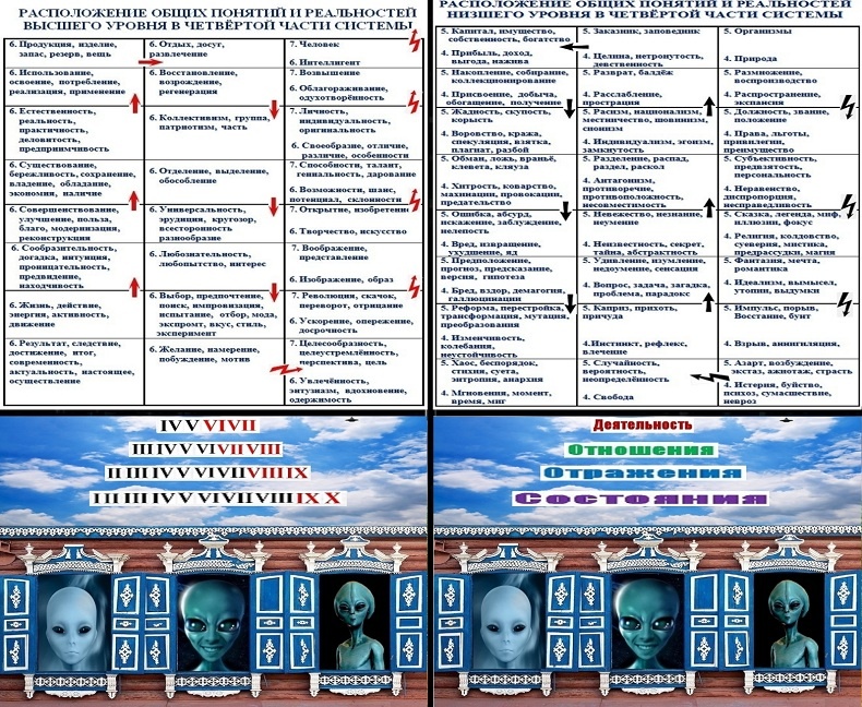 1. В последовательностях рядов и подуровней в четвёртой части системы языка отражаются сначала размножения организмов, затем отражаются разделения обывателей на группочки, затем отражаются обогащения некоторых обывателей. После этого отражается качественное развитие обогащающихся обывателей в людей, использующих резервы. Затем следует отражение отделения передовых групп и коллективов от общества. Завершается всё отражением целеустремлённых скачков, направленных на облагораживание и на возвышение людей как личностей. / Анализ слаборазвитых и высокоразвитых реальностей в четвёртой части системы показывает, что в двух правых рядах слаборазвитых общих реальностей отражаются распространение природных объектов и размножение организмов. Затем в двух средних рядах отражаются закономерности существования мелких замкнутых группочек, в виде дополнения к природным закономерностям существования очень больших групп, отражаемых в левом ряду второй части системы. Далее в двух левых рядах отражаются обогащающиеся обыватели, более развитые, чем размножающиеся организмы. /В левом ряду высокоразвитых общих реальностей отражается качественное развитие слаборазвитых обогащающихся обывателей до высокоразвитых активных сообразительных людей, использующих резервы. В среднем ряду отражается качественное развитие дополнений природных закономерностей существования больших объединённых групп и обществ до природных закономерностей существования отдельных коллективов. В двух правых рядах отражается качественное развитие от размножающихся организмов до облагороженных и возвышенных личностей, занимающихся творчеством, изобретениями и открытиями.