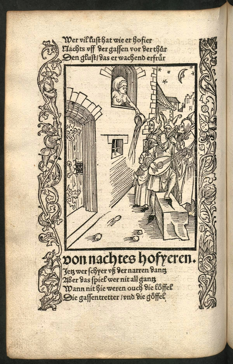 Изображение ниже часто публикуют как пример плохой гигиены в Средние века — в частности, чтобы поддержать представление, что выливание содержимого ночного горшка из окна было нормальным, общепринятым, обычным и регулярным явлением в средневековой Европе. Но правда немного иная. Сначала немного технических деталей: изображение взято со страницы 157 (77R) книги под названием «Daß Narrenschyff» (на английском наиболее известной как «The Ship of Fools» — «Корабль дураков»), изданной в 1494 году в Базеле, Швейцария, Себастьяном Брантом. Книга представляет собой так называемую сатирическую аллегорию, то есть критику неправильно ведущих себя людей — рассказ, полный ситуаций, указывающих на различные недостатки общества, высмеивающих и сатирически изображающих всё, что было с ним не так. В этой книге сто дураков путешествуют и совершают всевозможные поступки, которые господин Брант, а также средневековое общество в целом, считали сомнительным или просто дурным поведением.Конкретная глава, кото