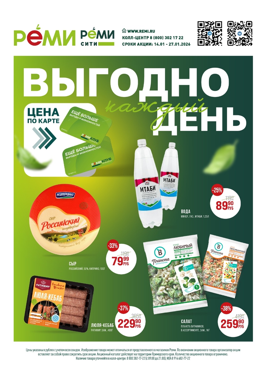 Отправляемся в мир выгодных покупок! В РЕМИ приятные цены становятся вашей постоянной реальностью! Мы гордимся тем, что можем радовать вас не только широким выбором товаров, но и тщательно подобранными продуктовыми наборами, а также вашими любимыми лакомствами по ценам, которые приятно удивляют. И чтобы сделать ваши покупки ещё более удобными, мы создали специальный каталог! В нём вы найдёте мясо, сыры и колбасы, пельмени и вареники, любимые десерты и многое другое. С 14 по 27 января на всё, собранное в нём, действуют скидки, и вы можете ознакомиться с этими товарами уже сейчас. До встречи! ✨