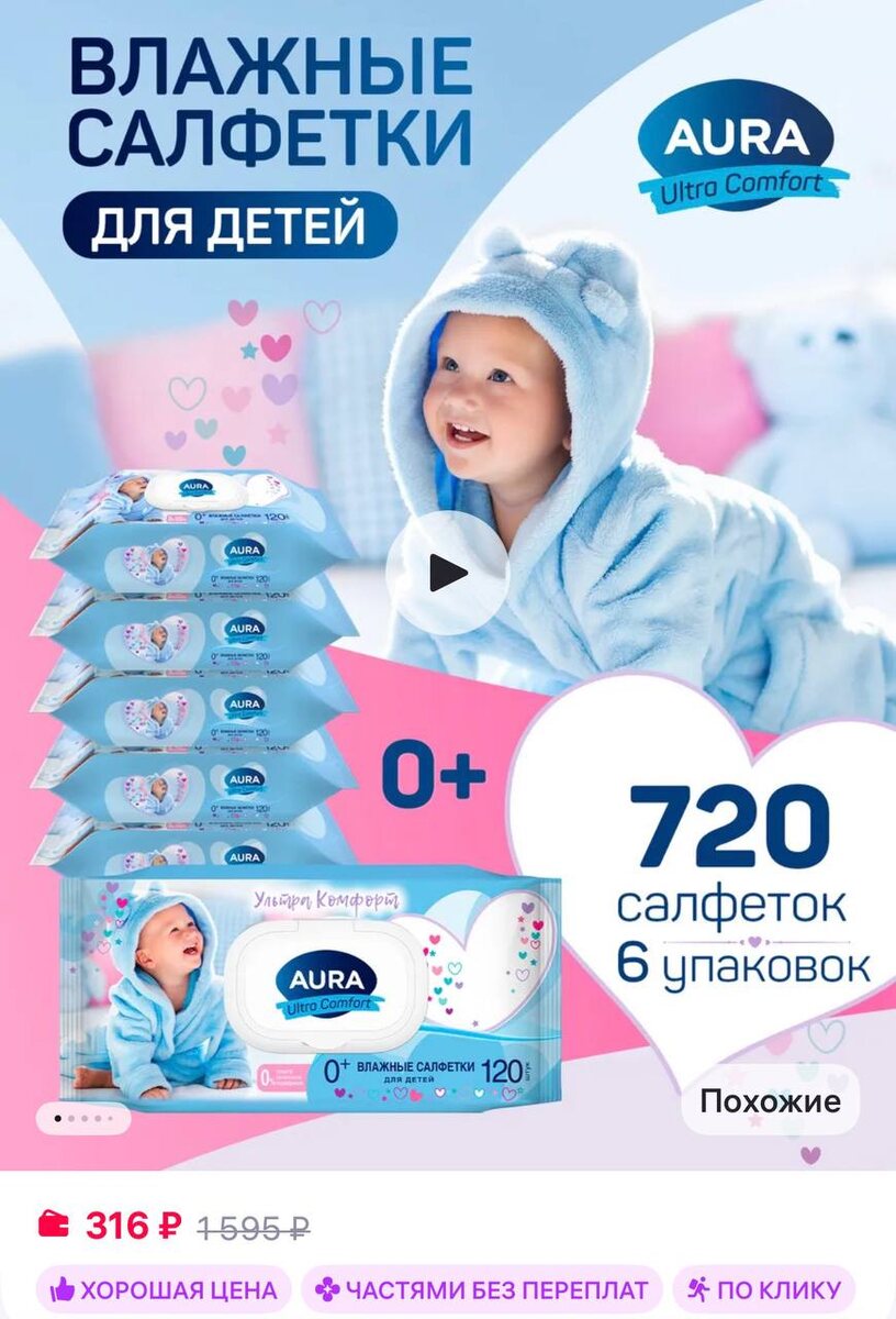 😔😃😪 720 шт Aura Влажные детские салфетки с клапаном для новорожденных 6уп х…