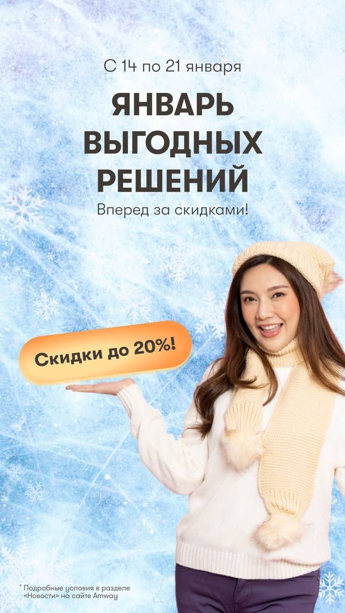 ! Начните новый год вместе с Amway и участвуйте в промо-акции «Январь выгодных решений»! https://www.kz.amway.com/promo-page? С 14 по 21 января вас ждут скидки до 20% на товары из промо-списка. Покупайте любимые продукты с максимальной выгодой и начните год с умных решений! Оформить заказ https://t.me/vip_klient_amway тел.: +7-922-40-40-833