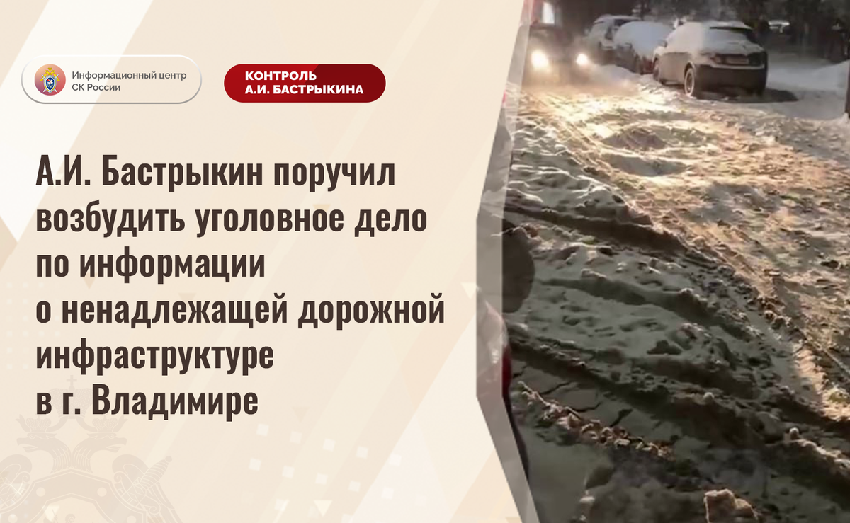 А.И. Бастрыкин поручил возбудить уголовное дело по информации о ненадлежащей дорожной инфраструктуре в г. Владимире В социальной сети сообщается о нарушении прав жителей города Владимира на качественную дорожную инфраструктуру. На протяжении длительного времени дорога, ведущая к школе, находится в непригодном состоянии: асфальтовое покрытие разрушается, на его поверхности образовались глубокие ямы. В результате передвижение по ней граждан небезопасно, а проезд автомобилей, в том числе осуществляющих доставку продуктов в столовую образовательного учреждения, затруднен. Несмотря на имеющиеся нарушения, мер к проведению ремонтных работ не принимается. Председатель Следственного комитета Российской Федерации Александр Иванович Бастрыкин поручил руководителю СУ СК России по Владимирской области Артему Александровичу Кулакову возбудить уголовное дело и доложить о ходе и результатах его расследования. Исполнение поручения поставлено на контроль в центральном аппарате ведомства. #Следственный