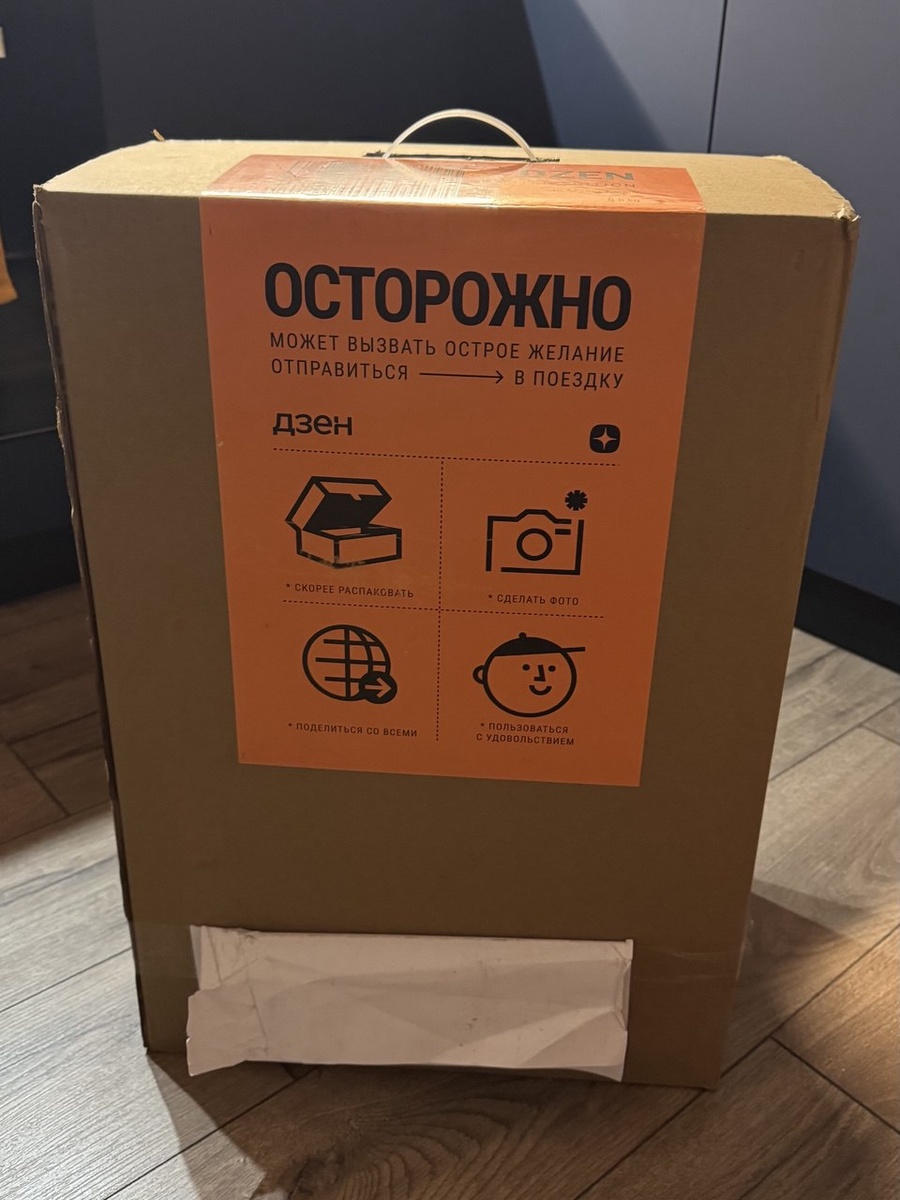 Новогодние праздники закончились. Ёлка загрустила, мандарины кончились, а я уже начала бронировать туры на лето. И тут - звонок. - Это служба доставки, вам посылка. Хм, странно, вроде бы я в последние дни ничего не заказывала на маркетплейсах. Что за посылка? Загадка. Конечно, мне не терпелось поехать и забрать загадочную посылку, несмотря на то, что на улице уральские метели. Приезжаю на пункт выдачи - ого! Какая огромная коробка: И на ней знакомая надпись, по которой я поняла, что посылка от площадки Дзен. Коробка, размером с небольшой шкаф. В голове мелькнула мысль: "Неужели Дзен прислал мне мини-бар? Чтобы в горле не пересыхало, пока я статьи пишу?" Еле дотащила этот монолит до квартиры, открываю коробку, а там.....Что бы вы думали? ЧЕМОДАН!!! Это не просто чемодан, а произведение искусства от САМОГО Дзена! Лимитированная коллекция, как указано на этикетке! Стильный, черный, лаконичный, с выбитой эмблемой Дзена. Все ручки того самого фирменного оранжевого цвета и на каждой выбито