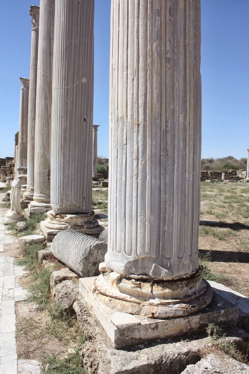 Колонны древних античных строений изготавливали из известняка или мрамора. Реже встречаются гранитные. Как их обрабатывали бронзовыми инструментами до совершенной геометрии – отдельный вопрос. В истории считается, что все делали вручную, на глаз. Никаких механизмов и тем более станков тогда не было. Другое мнение сообщает, что колонны из известняка или мрамора не обрабатывали, их отливали или наносили штукатурку из этого материала на грубую заготовку. А потом простым инструментом резали еще не набравший прочность материал. Возможно верны оба мнения, т.к. есть примеры и того и другого. Это мраморная колонна армированная арматурой в античном храме на Кипре (античный город Саламис). Может быть это повторно разрушенная реконструкция XIX века колонн храма. А, может быть, разрушение показало технологию, на которую были способны древние мастера. Вот, только откуда они взяли гладкую арматуру из железа в то время? В некоторых античных развалинах можно увидеть колонны с совершенно другой породой