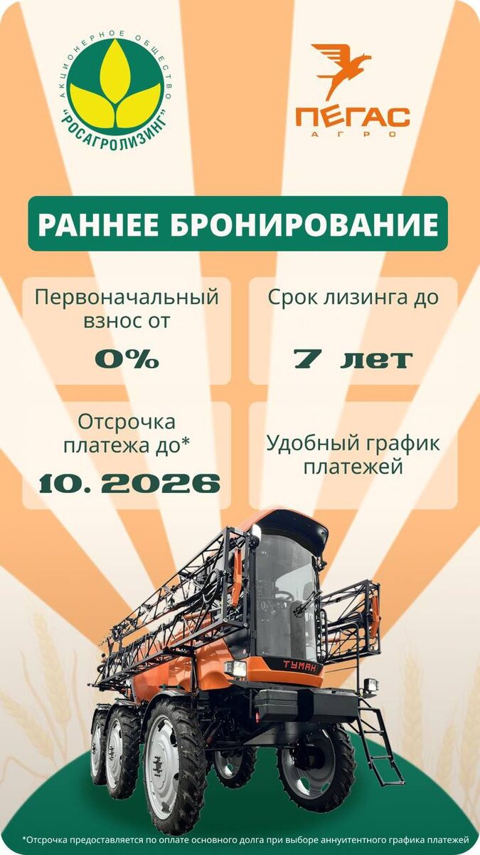 » Не упустите шанс обновить технику с выгодой! 🚜 Приобретайте технику «Пегас-Агро» в рамках новой акции от АО «Росагролизинг». Данная программа льготного лизинга помогает аграриям заранее подготовиться к новому сезону и оформить технику на выгодных условиях. Условия акции действуют до 31 декабря 2025 года: ✅ Плати, когда удобно. Отсрочка платежа до октября 2026 года.* ✅ Аванс от 0%. Техника и оборудование в лизинг без первоначального взноса. ✅ Срок лизинга до 7 лет. Комфортный размер ежемесячного платежа. ✅ Удорожание от 4% в год**. Лизинг по сниженной ставке. ✅ Возможность зафиксировать стоимость техники. Стоимость техники не изменится в процессе сделки. *Отсрочка предоставляется по основному долгу при выборе аннуитетного графика платежей. ** Среднегодовое удорожание является расчетной величиной и зависит от параметров сделки и предмета лизинга. Как подать заявку? Оформите заявку онлайн через личный кабинет на сайте АО «Росагролизинга». Уточнить условия акции можно у о