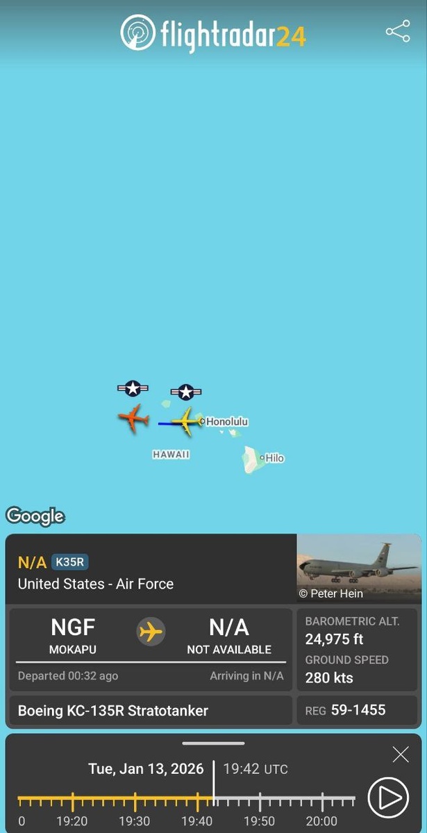 Зафиксировано активное перемещение самолетов-заправщиков ВВС США. 13 января на Гавайи, в аэропорт Гонолулу, прибыли восемь воздушных танкеров KC-135. Два из них — борта с регистрационными номерами 59-1455 и 59-1483, летящие под позывным EDDIE91, — уже 14 января взяли курс на запад. По всей видимости, их конечной целью является авиабаза Диего-Гарсия в Индийском океане, откуда они могут быть