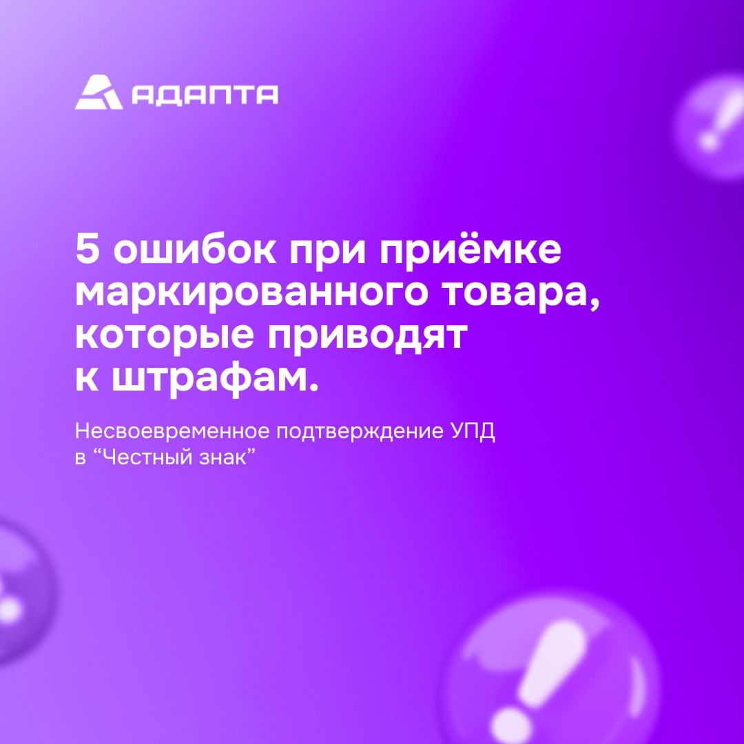Ошибка №1 — не подтвердили УПД (универсальный передаточный документ) в «Честном ЗНАКе» вовремя. Самая частая ситуация: товар уже на складе, в учёте всё проведено, но УПД в «Честном знаке» не подтверждён в срок. 📌 По закону у вас есть 3 рабочих дня с момента получения товара, чтобы подтвердить УПД в системе маркировки. Это обязательное требование! ⚠️ Что за это бывает: — должностному лицу: до 10 000 ₽ — компании: до 100 000 ₽ И важный момент: штраф возможен даже, если товар реальный, оплачен и уже используется в работе. Почему риск растёт. Одобрен законопроект, по которому система «Честный знак» сможет автоматически фиксировать часть нарушений и формировать штрафы (в первую очередь по табачной продукции и просрочке). То есть «человеческий фактор» будет играть всё меньшую роль. 👉 Вопрос, который стоит себе задать: вы точно знаете, кто у вас отвечает за подтверждение УПД и как контролируются эти 3 дня? #АДАПТАзнает