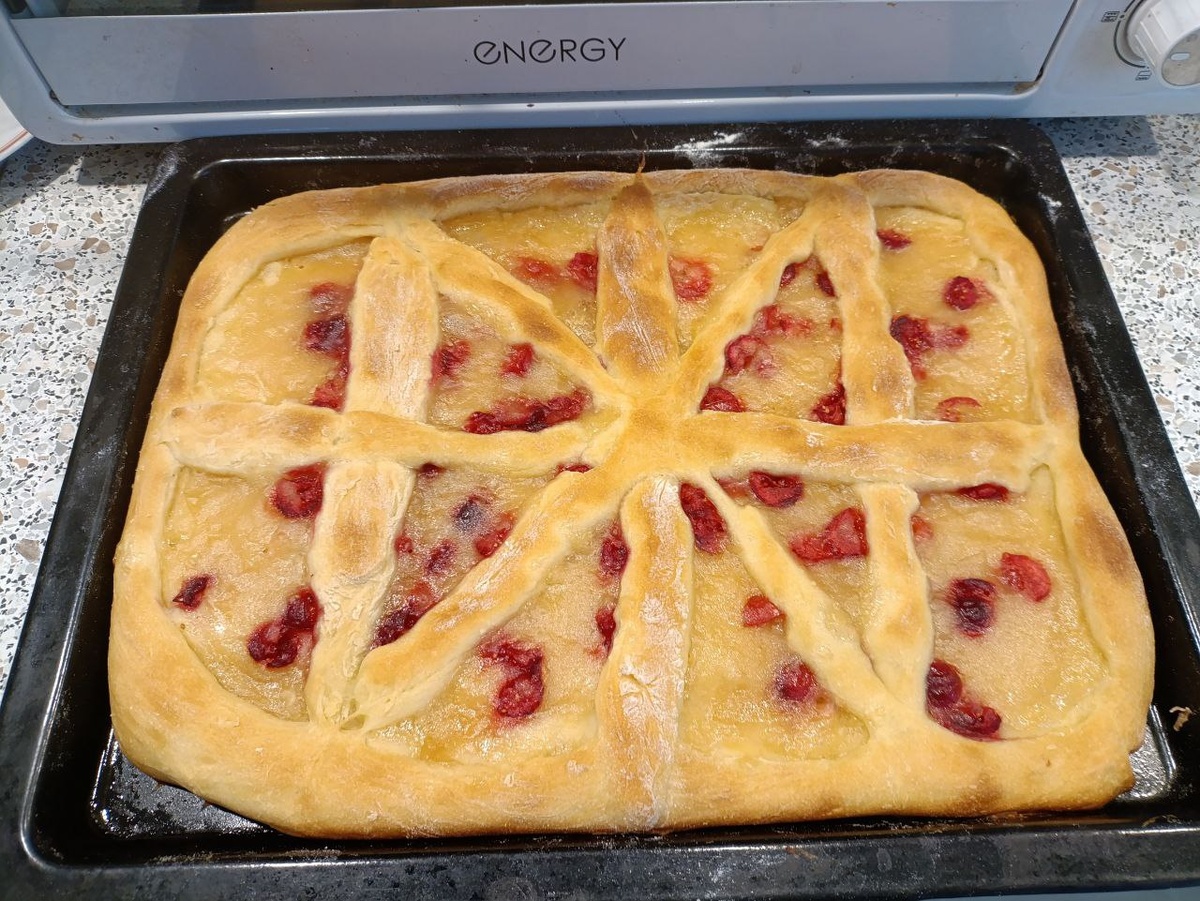 Как всегда всё на глаз. (Яйцо, сахар, масло раст. вода, мука, дрожжи) Тесто не должно быть слишком густым, стоит часа два у меня, поднимается. Уверена, что в следующий раз получится по-новому, по-другому. Начинка у меня повидло яблочное(я его сама варю и клюква мороженая) Сегодня результат идеальный, мало теста, много начинки.Всё хорошо пропеклось. Тесто очень тонко раскатываю. Растягиваю его руками. Сразу кладу начинку, ещё стоит минут двадцать в холодной духовке, потом включаю духовку и выпекаю минут сорок. Сверху украшение так себе, как попало, на скорую руку, не хотела его никому показывать, для себя испекла.