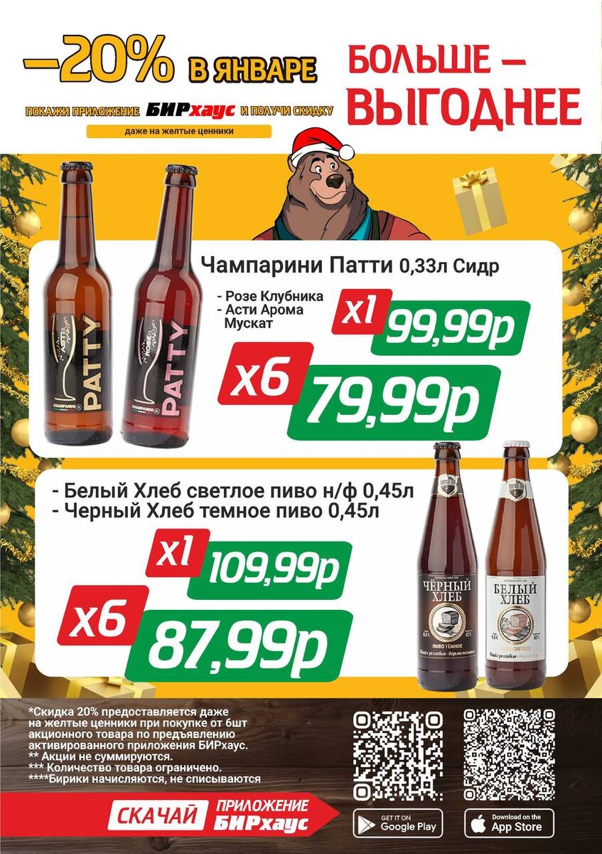! 🔥 Покупайте от 6 штук — и получайте скидку 20% по акции 🍻 В акции участвуют: 🍎 Сидр Чампарини Патти — Розе Клубника — Асти Арома — Мускат 🍺 «Белый хлеб» — светлое пиво 🍺 «Чёрный хлеб» — тёмное пиво 💛 Важно: скидка 20% действует даже на жёлтые ценники — при покупке от 6 штук акционного товара и по предъявлению активированного приложения БИРхаус. 🎁 Бирики начисляются, но не списываются ⚠️ Количество товара ограничено Самое время закупиться выгодно — январь создан для хороших скидок!