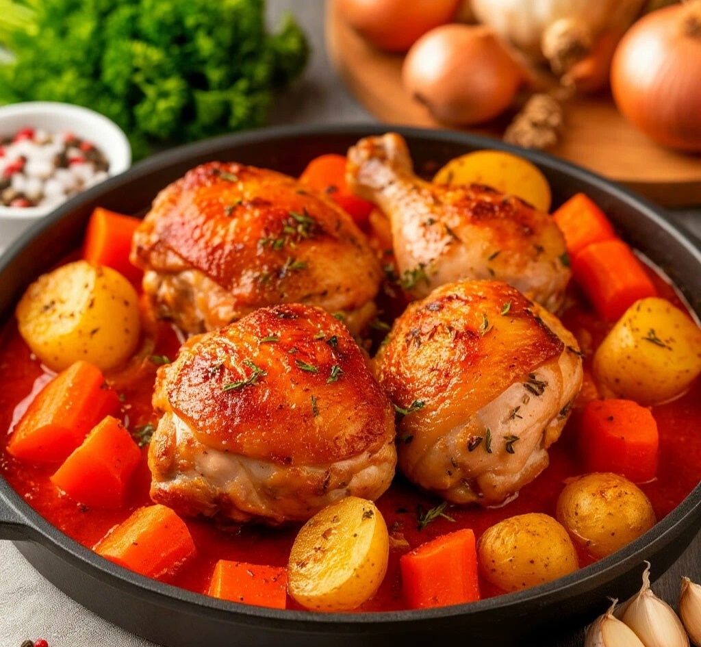 ИНГРЕДИЕНТЫ (на 4 порции): 🧾 ·Куриные бёдра (или голени) — 800 г 🍗 ·Картофель — 6-7 шт. (800 г) 🥔 ·Морковь — 2 крупные шт. 🥕 ·Лук репчатый — 2 шт. 🧅 ·Чеснок — 3 зубчика ·Томатная паста — 1 ст.л. ·Растительное масло — 3 ст.л. ·Соль, перец, паприка молотая — по вкусу ·Вода — около 300 мл