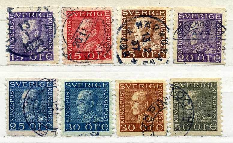 продаю 8 почтовых марок Швеция 1921-1936 год. стандарт. король Густав 5. гашеные. Стоимость набора 120 рублей