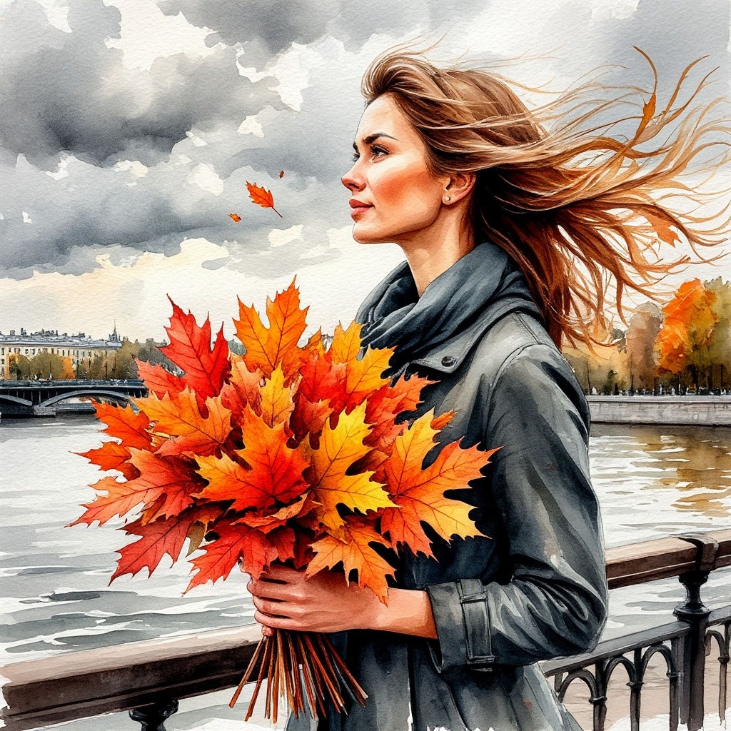 Нагулявшись по дорожкам парка, Марина, разрумянившаяся и довольная, вышла на набережную. Ветер играл её растрепавшимися волосами, и яркие кленовые листья бились и трепетали в её руке, как крылья пойманной птицы.