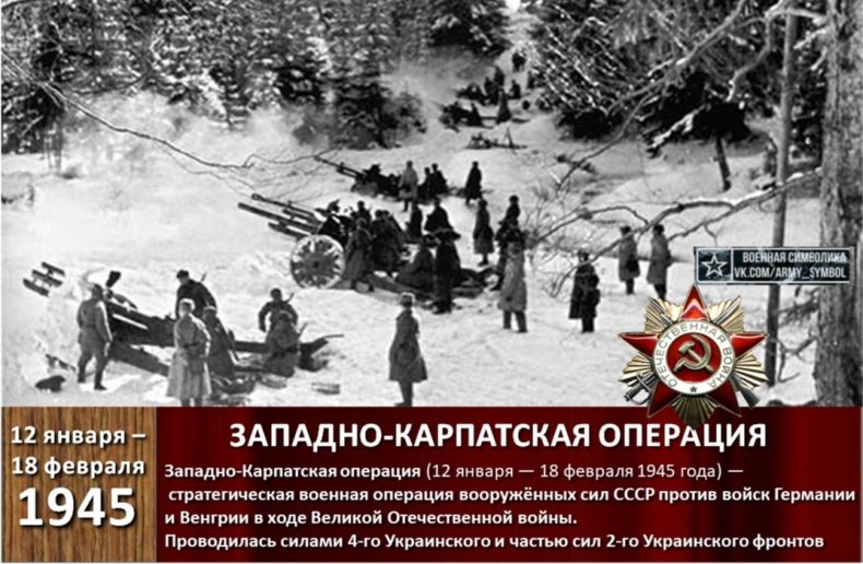Проводилась операция силами 4-го Украинского и частью сил 2-го Украинского фронтов с 12 января по 18 февраля 1945 года. В результате Западно-Карпатской операции были освобождены большая часть Словакии и южные области Польши, нанесен большой урон 17 дивизиям и бригадам противника. Он потерял около 2300 орудий и минометов, 320 танков и штурмовых орудий, свыше 137 тыс. человек пленными, около 80 тысяч личного состава убитыми и раненными. Разгромив противника в Словацких Рудных горах, Красная Армия лишила Германию важного района добычи цветных металлов. Своими активными действиями войска 4-го Украинского фронта сковали в Западных Карпатах крупные силы врага и тем способствовали успеху 1-го Украинского фронта в Силезии. Были созданы условия для наступления с целью овладения Моравска-Остравским промышленным районом. Особ
