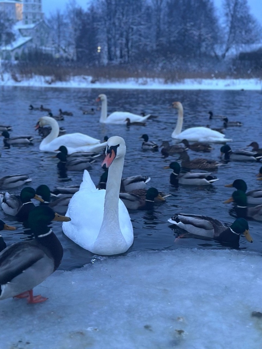 Зимний вечер опускается на реку тихо и неспешно. Небо окрашено в глубокие синие оттенки, а морозный воздух наполнен спокойствием. Вдоль берега лежит ледяная кромка, на которой, словно белоснежные статуи, стоят величественные лебеди. Их стройные шеи и безупречно белые перья особенно ярко выделяются на фоне тёмной воды.