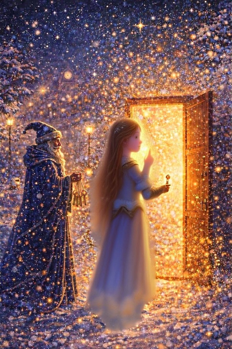 ✨ В самую длинную ночь года, когда небо становится чуть ниже, а звёзды светят ближе, в одном городе произошло маленькое чудо. Человек проснулся от тихого звона 🔔 Будто кто-то тронул стеклянный колокольчик. За окном падал не обычный снег. Каждая снежинка светилась, как если бы внутри неё жило желание ❄️✨ Они медленно кружились и, касаясь земли, не таяли — а превращались в золотую пыль. Человек накинул тёплый свитер и вышел на улицу. И тут он увидел Его. Новый год стоял под фонарём. В длинном синем плаще, расшитом звёздами 🌌 В руках — ключи. Много ключей. Они тихо звенели и переливались светом. — Ты вовремя, — сказал Новый год. — Куда? — спросил человек. — К себе, — улыбнулся он. Они шли по улице, и каждый шаг открывал что-то невидимое 👣✨ Двери появлялись прямо в воздухе. На одной было написано: «Смелость» На другой — «Тишина» На третьей — «Желание, которое ты давно отложил» 💫 — А если я боюсь? — прошептал человек. — Тогда мы откроем дверь вместе, — спокойно ответил Новый год