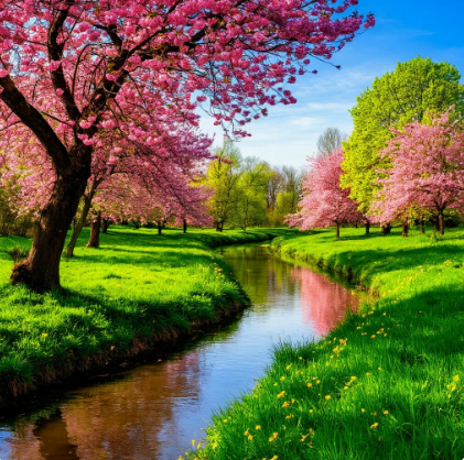 На изображении представлена живописная весенняя сцена. В центре протекает река, в которой отражаются деревья и небо. По обеим сторонам реки растёт зелёная трава, усеянная жёлтыми цветами. Справа на переднем плане растут деревья с ярко-розовыми цветами, возможно, это цветущая сакура. Слева от реки растут высокие деревья с густой зелёной листвой. Небо ясное, голубое, с небольшими белыми облаками. Вся сцена наполнена яркими красками и создаёт ощущение спокойствия и умиротворения.