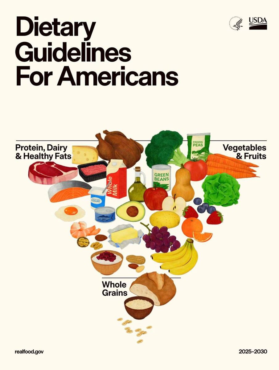 Везде встречаю информацию о новой пирамиде питания США, уже как только не перевернули эту информацию. Но если открыть оригинальный документ с пирамиой питания, там всё проще. Если вы видите заголовки: «США запретили сахар» / «разрешили масло» / «злаки вред» — это почти всегда кликбейт. В реальном документе смысл один: основа рациона = реальная еда, меньше ультра-переработанного, меньше сахара. По сути мало что изменилось, разве что изображение самой пирамиды питания... И началась шумиха Что там реально: 🍖Белок — регулярно, из разных источников (животных и растительных) - 1.2–1.6 г белка/кг/сут. 🥦Овощи + фрукты — каждый день (это “скелет” рациона). Ориентиры: более овощи — 3 порции/день, фрукты — 2 порции/день (для рациона 2000 ккал) 🍲Цельные злаки — да; рафинированные/упакованные углеводы — резко меньше. Рекомендация: цельные злаки 2–4 порции/день; и значительно снизить рафинированные/переработанные углеводы (в тексте перечислены примеры типа белого хлеба, готовых завтраков,