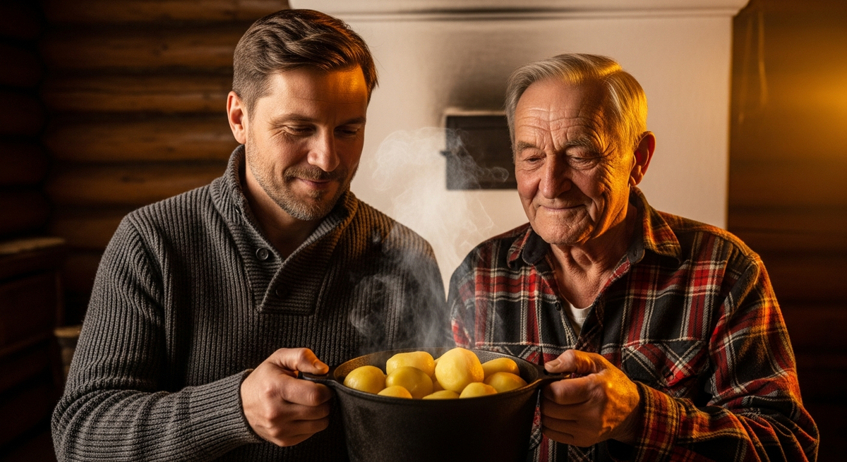 Анна Петровна достала чугунок. Настоящий, чёрный от времени. Почистила картошки, кинула туда кусок сала, луковицу целиком. Николай Степанович ухватом — ловко так, привычно — отправил чугунок в самое чрево печи, прямо к углям.
