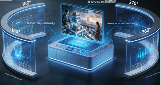 В продукте используется передовая технология реконструкции светового поля, поддерживающая вывод изображения в разрешении 4K сверхвысокой четкости с плотностью пикселей до 3840×2160, что обеспечивает четкие и тонкие детали изображения и почти 100% цветопередачу. Будь то сложные конструкции изделий, тонкие выражения лиц людей или масштабные сцены, все может быть точно представлено в трехмерном формате, обеспечивая зрителям захватывающее визуальное впечатление. Одновременно с этим, продукт поддерживает различные форматы голографических изображений, включая голографические дисплеи/экраны с углом обзора 180°, 270° и 360°, что позволяет гибко выбирать формат в зависимости от требований сцены и создавать эффект полного погружения с разных ракурсов.