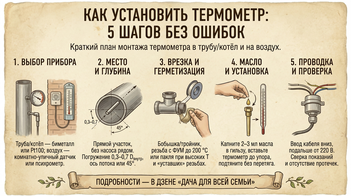 Для надёжного контроля температуры у себя дома и на участке я рекомендую три рабочих решения: стрелочный биметаллический термометр в гильзе для труб и котла, электронный термометр сопротивления Pt100 (или датчик с выходом 4-20 мА) для автоматики и цифровой комнатно-уличный термометр для воздуха в теплице и жилых комнатах. Схема установки у первых двух общая: гильза в поток, конец чувствительного элемента на оси или под 45° к потоку, глубина погружения 0,3-0,7 внутреннего диаметра трубы, в гильзу залить масло, кабельный ввод вниз. Для воздуха — тень, высота 1,5-2 м, без прямого солнца и сквозняка.