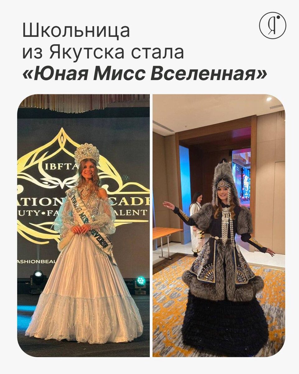 » 🌍✨ Школьница из Якутска Арина Аулова победила на международном конкурсе YOUNG UNIVERSE BEAUTY 2025 в Македонии и завоевала титул «Юная Мисс Вселенная», представляя Россию. Финал прошёл в Скопье с 8 по 12 января. Вместе с короной Арина получила золотую медаль Пьера Кардена. Особое впечатление произвёл её выход в якутском национальном костюме «Дьол тааһа» («Камень счастья») и выступление с флагом Якутии 💎 Online Якутия | Ждем вас в МАХ