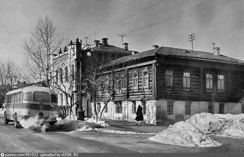 Н. Стрельникова (кирпичный) Описание: Бывший дом крестьянина Я.Н. Стрельникова (кирпичный), он же Дом санитарного просвещения, и автобус ЗиЛ-158В на улице Советской. 1960-е годы 1960—1969, Россия, Курганская область, Курган Адрес: угол Советской и 1-й Заводской https://vk.cc/cTomKK
