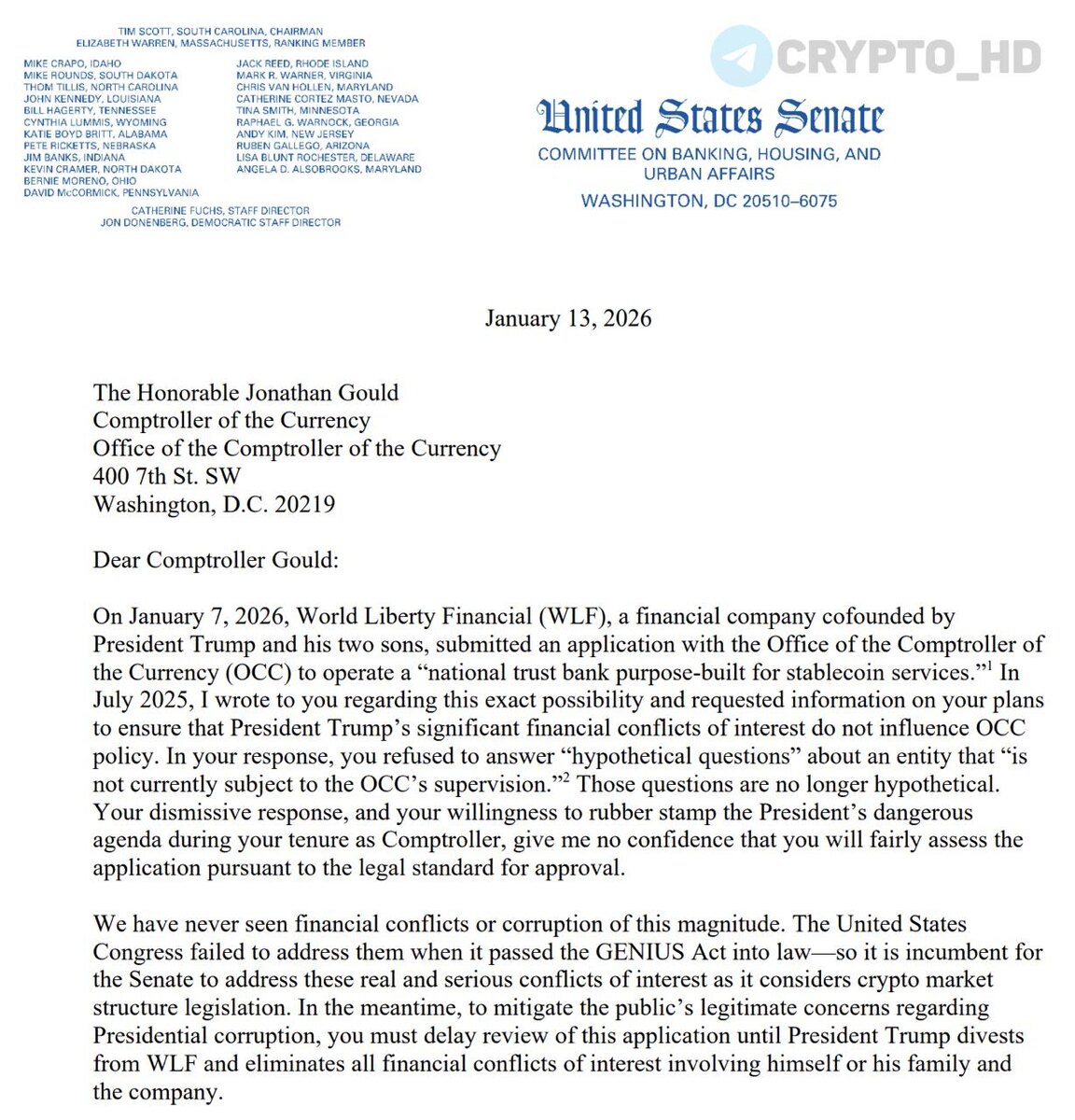 🇺🇸 Элизабет Уоррен требует от банковского регулятора США заморозить заявку World Liberty Financial на банковскую лицензию. Сенатор считает, что рассматривать заявку нельзя до тех пор, пока Дональд Трамп не разорвет финансовые связи с проектом, поскольку президент США фактически сможет влиять на регулятора, который будет контролировать его собственную финансовую компанию. Ранее: - Уоррен против крипты в 401(k) - криптодоходы семьи Трампа - $1b на крипте - крипто-империя Трампа Crypto Headlines