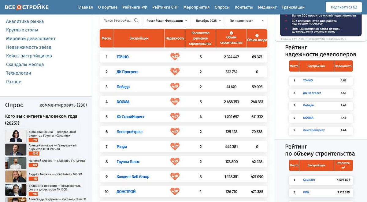 ⚡️Подвели итоги рейтинга надёжности застройщиков России за 2025 год от Всeостройке.pф