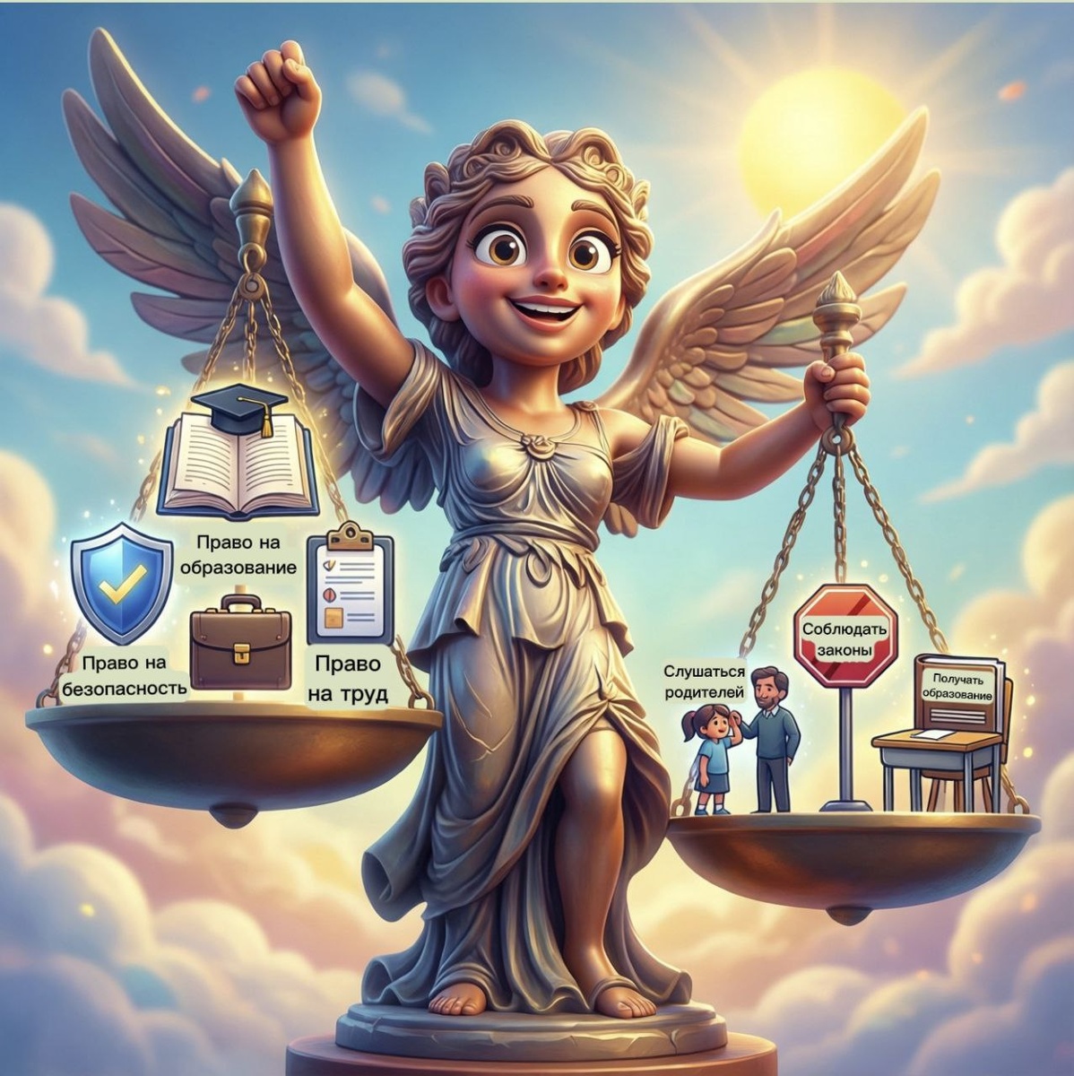 📚⚖️ Привет, будущий юрист! Знаешь ли ты, что у детей тоже есть права и обязанности? Сегодня мы узнаем, что можно и нельзя делать по закону, и как защищать свои права! Что такое «юридическая грамотность»? 🤔 Это знание законов, которые тебя защищают: · Твои права 🛡️ · Твои обязанности 📝 · Как действовать в сложных ситуациях 🚨 · Куда обращаться за помощью 🏛️ Это как: Изучать правила дорожного движения, но для жизни в обществе! 3 главных права каждого ребенка: 1️⃣ Право на безопасность 🏠 · Тебя должны защищать от насилия · Нельзя оставлять маленьких детей одних · Пример: Если тебе угрожают — сразу к взрослым! 2️⃣ Право на образование 🎒 · Все дети должны учиться · Школа должна быть безопасной · Важно: Учитель не имеет права унижать учеников! 3️⃣ Право на личное мнение 💬 · Ты можешь высказывать своё мнение · Родители должны его учитывать · Но: С уважением к старшим! А какие есть обязанности? 📋 Что ты должен делать: 1️⃣ Слушаться родителей (пока не исполнилось 18) 2️⃣