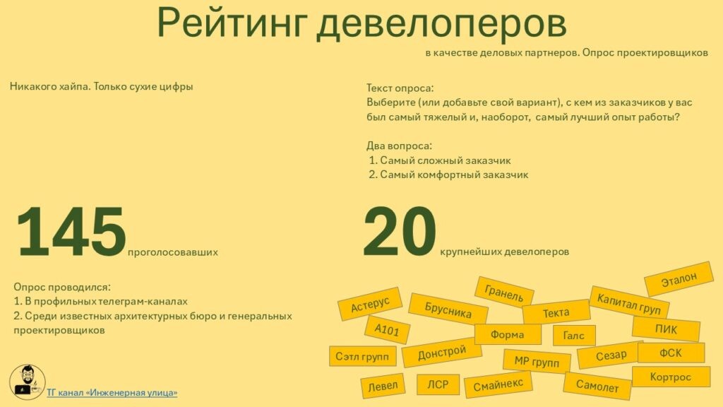 Как выглядит картина современного строительного рынка глазами проектировщиков? Кто из девелоперов сложен, как заказчик, а значит требует больших трудозатрат и времени на работу? А с кем работать комфортно и предсказуемо? Не так давно мы запустили опрос, чтобы узнать мнение проектного рынка о том, сотрудничество с какими заказчиками приносит больше положительного опыта, чем отрицательного. Для этого предложили проектировщикам сделать выбор из списка двадцати крупнейших девелоперов. Этот опрос был задуман не для того, чтобы кого-то обесценить или восхвалить. И у нас нет желания вызывать хайп. Задача практичная – выяснить, на работу с каким заказчиком, в силу специфики его подхода, лучше отвести повышенные трудозатраты и предусмотреть соответствующие сроки проектирования. А с кем сотрудничество идет более гладко, предсказуемо, с возможностью достичь компромисса, а значит – в пределах планируемых расходов. Опрос проводился: