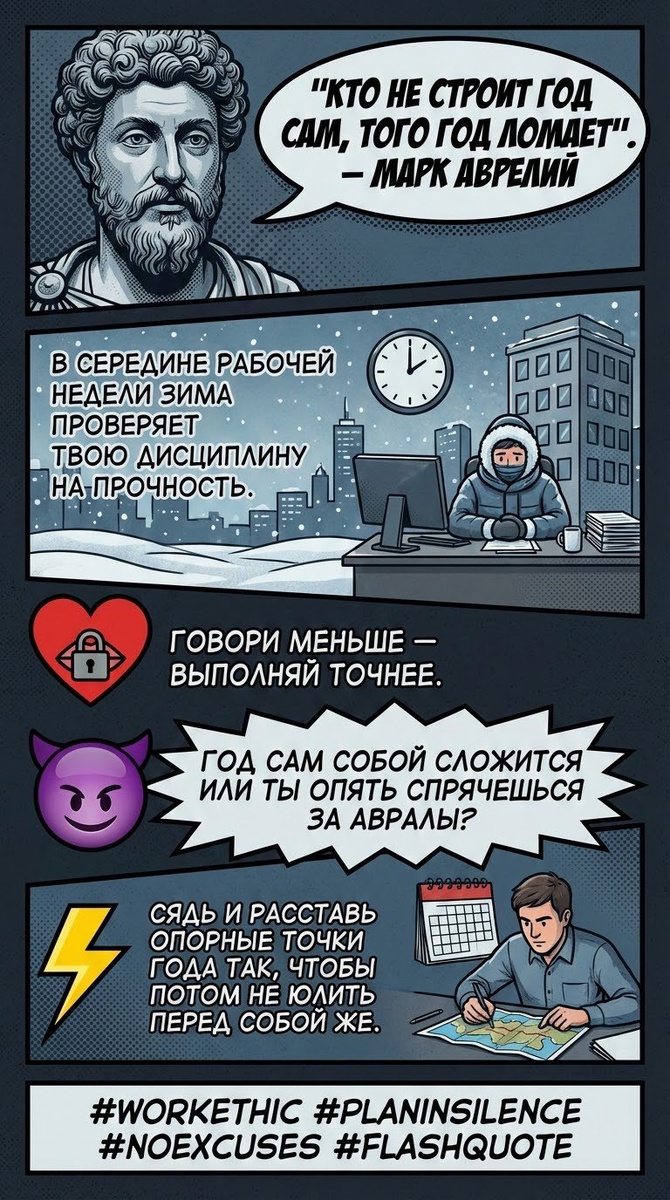 ". — Марк Аврелий 🖤 В середине рабочей недели зима проверяет твою дисциплину на прочность. ❤️ Говори меньше — выполняй точнее. 😈 "Год сам собой сложится или ты опять спрячешься за авралы?" ⚡ Сядь и расставь опорные точки года так, чтобы потом не юлить перед собой же. #WorkEthic #PlanInSilence #NoExcuses #FlashQuote