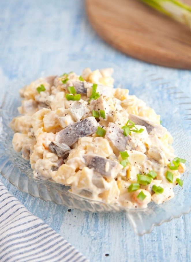 Может, с Шубой я погорячилась - но если забыть про многослойность и свеклу, это Шуба. Белая. А если забыть про аналогии и похожести - это просто исключительно вкусный салат. Его хочется готовить зимой - когда так в охотку сытные, аппетитный и одновременно легкие салаты. С привычными, традиционными вкусами - зимних праздников. Салат хорош и без гарнира - блюдо это самодостаточное, и в сопровождении гарниром не нуждается. От Шубы еще отличается размером нарезки: мельчить не нужно - вкус каждого ингредиента должен чувствоваться. А готовится моментально - рассказывать долго не придется. Лучший аналог Шубы - или почти лучший: салат с сельдью, рецепт + ингредиенты 1) Селедку разделать, приготовить филе, нарезать на умеренно крупные кусочки - шириной до 1 см. Или использовать готовое филе, “из банки”: размер кусочков идеально подходит для салата. Картошку отварить в мундире. Вкус у нее более яркий, “концентрированный” :) Лучше заранее, чтобы полностью остыла. И даже застыла: чтобы не крошила