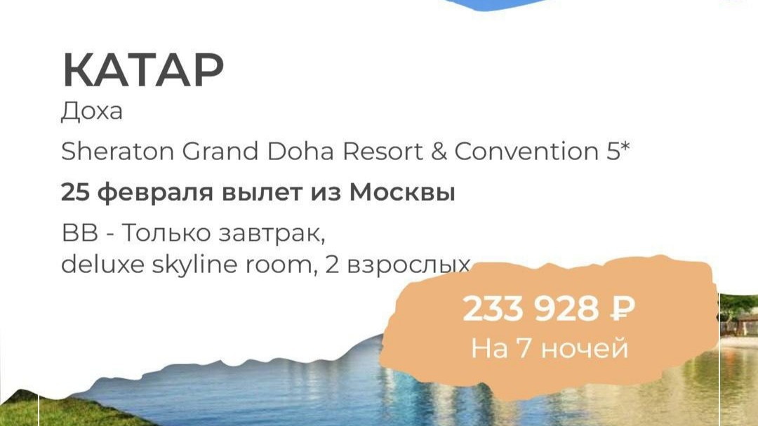 Наши туристы обожают 2 отеля. Один из них — вот такой. Хотите город, но как в оазисе? Огромная зеленая территория с пальмами, фонтанами и газонами — тишина и релакс в центре города. Хотите пляж? Свой песчаный, чистый, с пологим входом и шезлонгами. Плюс шикарные виды на West Bay и отличный сервис. А если бассейн, то вау. Огромный лагунный, с подогревом, много зелени и уютных уголков. Добавим вкусную еду и идеальную локацию: разнообразные завтраки и ужины, набережная Корниш под окнами, аэропорт — 15–20 минут. Отель есть в нашей подборке.