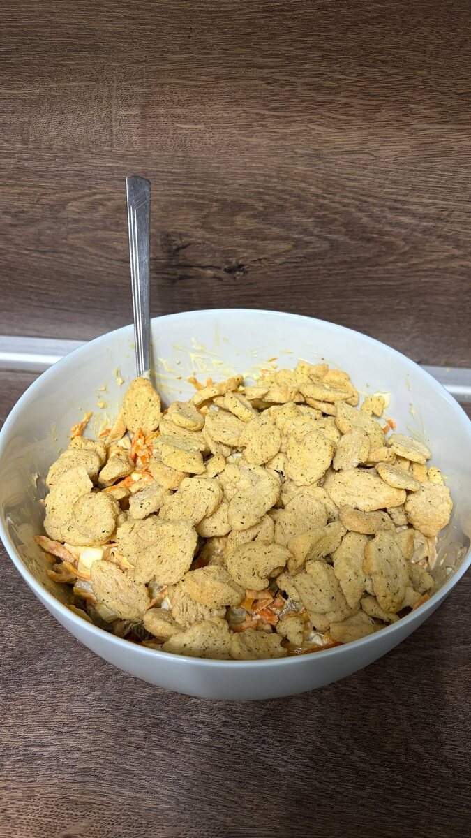 Ингредиенты: Свинина Лук Морковь Соленые огурцы Яйца вареные Сухарики Майонез Приготовление: Мясо, лук и морковь нарезаем полосочками. Обжариваем на растительном масле сначала свинину, потом к ней добавляем морковь, затем лук, солим. Выкладываем в салатник. Режем вареные яйца и огурцы, тоже добавляем в салатник. Заправляем майонезом, перемешиваем. Сверху выкладываем сухарики. #салат
