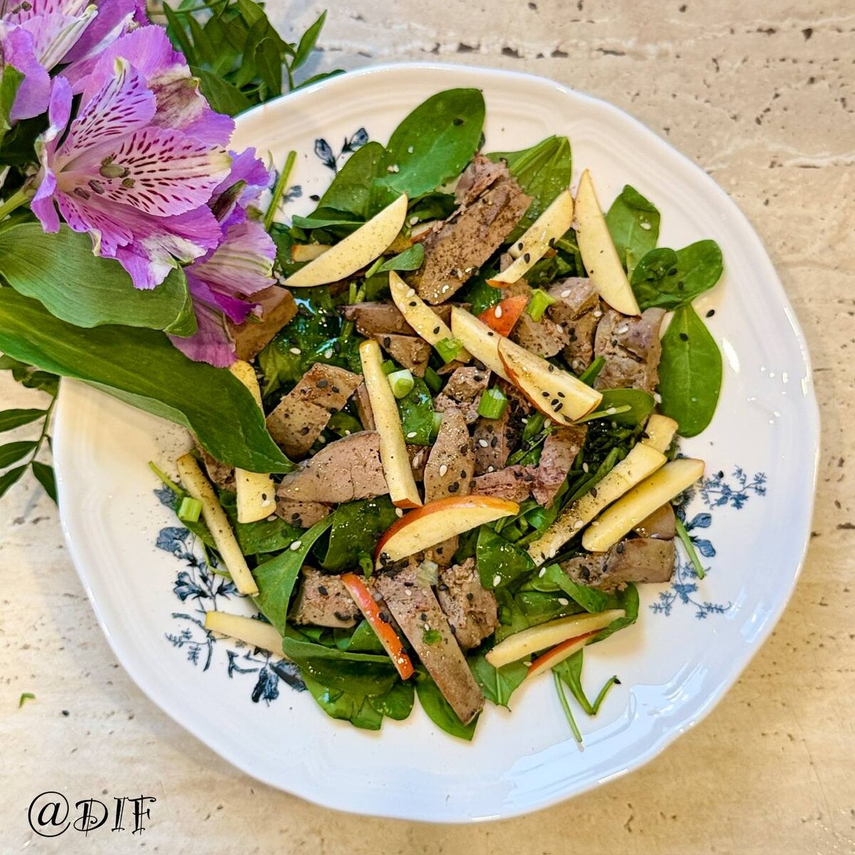 ))) В советские времена печень в основном в продаже была свиная. О том, что она бывает телячья, или индюшачья , а еще о боже кролика никто даже и не подозревал: говяжья продавалась только в готовом виде по пятницам в кулинарии. Да и то нужно было отстоять очередь, придя домой счистить с нее слой муки, изображавший панировку, а затем можно было ее перетушить с лучком в сметане, чтобы облагородить вкус. Но благо времена то уже , когда все везде есть , поэтому давайте приготовим очень вкусный и легкий : 🍃🍃🍃🍃🍃🍃 🍃🍃🍃🍃🍃 🍃🍃 🍃🍃🍃🍃🍃🍃 Берем: -400 г куриной печени ( печени кролика или индейки). -1 ст. л. соевого соуса -3 ст. л. оливкового масла большая горсть хорошо промытой пряной рукколы или шпината или любимой травки -половина кисло-сладкого яблока -черный свежемолотый перец по вкусу -рубленая свежая петрушка по вкусу Поехали: Куриную печень разрезать, приправить и залить соевым соусом, мариновать в прохладном месте 1 час. На сковороде с толстым дном хорошо разо