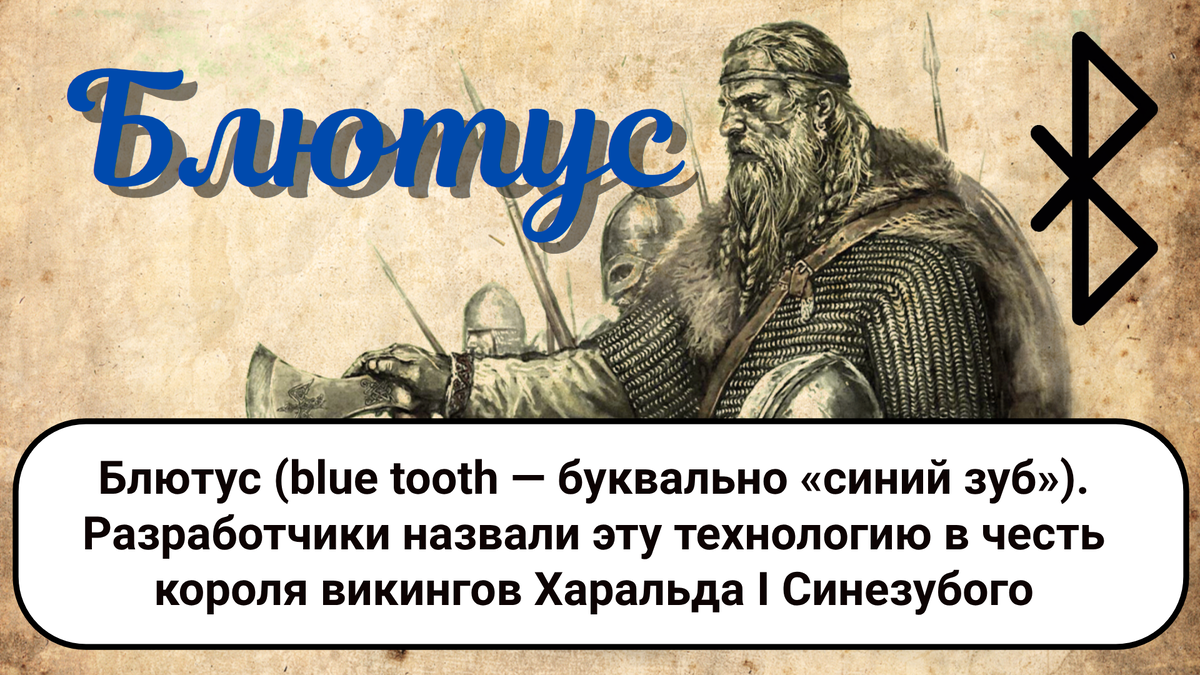 Одно из немногих слов в нашей рублике #тайныслов где нет какого-то особого тайного или мистического смысла. Просто датчане, которые создали эту технологию, были патриотами и назвали своё творение в честь короля викингов Харальда I Синезубого (Harald Blåtand). Фраза «blue tooth» — (буквально «синий зуб») – англоязычная адаптация датского «blåtand». Значок блютуса тоже родом из той древней эпохи. Он состоит из наложенных друг на друга скандинавских рун “Н” и “B” (hagall и berkana). Это просто инициалы короля…