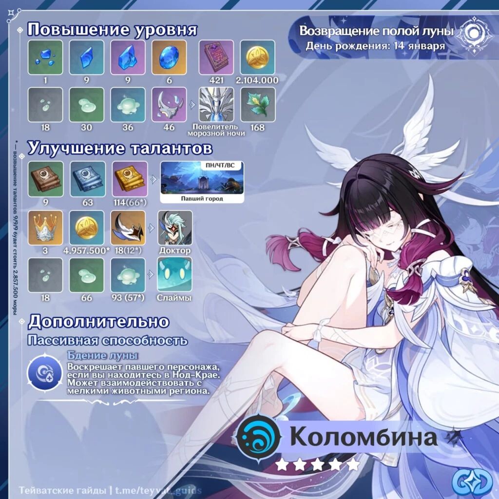 ㅤОднако, если вы не играете и не планируете игру через Лунные реакции, то Коломбину можно пропустить и вложиться в то, что действительно вам нужно. Для новичков Коломбина будет отличным персонажем для создания отрядов с Лунными реакциями, ведь мы можете задействовать её и с практически любыми Электро/Дендро/Гео персонажами в отряде.