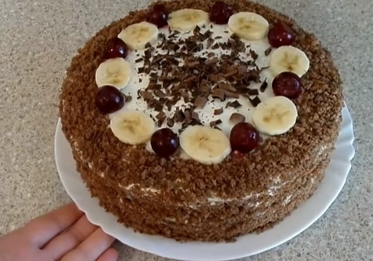 7. Верхушки коржей измельчаем в крошку и обсыпаем бока и по кайме верха. Сверху можно украсить еще вишней, кусочками банана и тертым шоколадом.