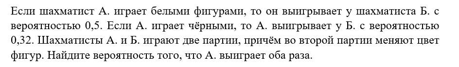 Дерево эксперимента, или дерево вероятностей, является удобным и универсальным инструментом решения вероятностных задач. Дерево позволяет рассматривать составной эксперимент как бы «по частям». Событие A можно рассматривать при условии, что событие B произошло. Точно так же можно считать, что случилось A, и тогда ставить вопрос о вероятности события B. Эти условные вероятности удобно надписывать около соответствующих рёбер дерева. Удобно принять некоторые правила. Построение дерева начинаем с точки S (от слова «Start»). Элементарные события опыта представлены цепочками, идущими от S вниз к какой-нибудь конечной вершине. Промежуточные и конечные вершины будем обозначать так же, как события, или другими подходящими буквами (иногда совпадающими), в зависимости от того, как удобнее в конкретной задаче. Важно! Сумма вероятностей на всех рёбрах, выходящих из общей вершины дерева всегда равна единице. Задача №1 Решение. Составим дерево случайного эксперимента Ответ 0,16 Задача №2 Решение. Сос